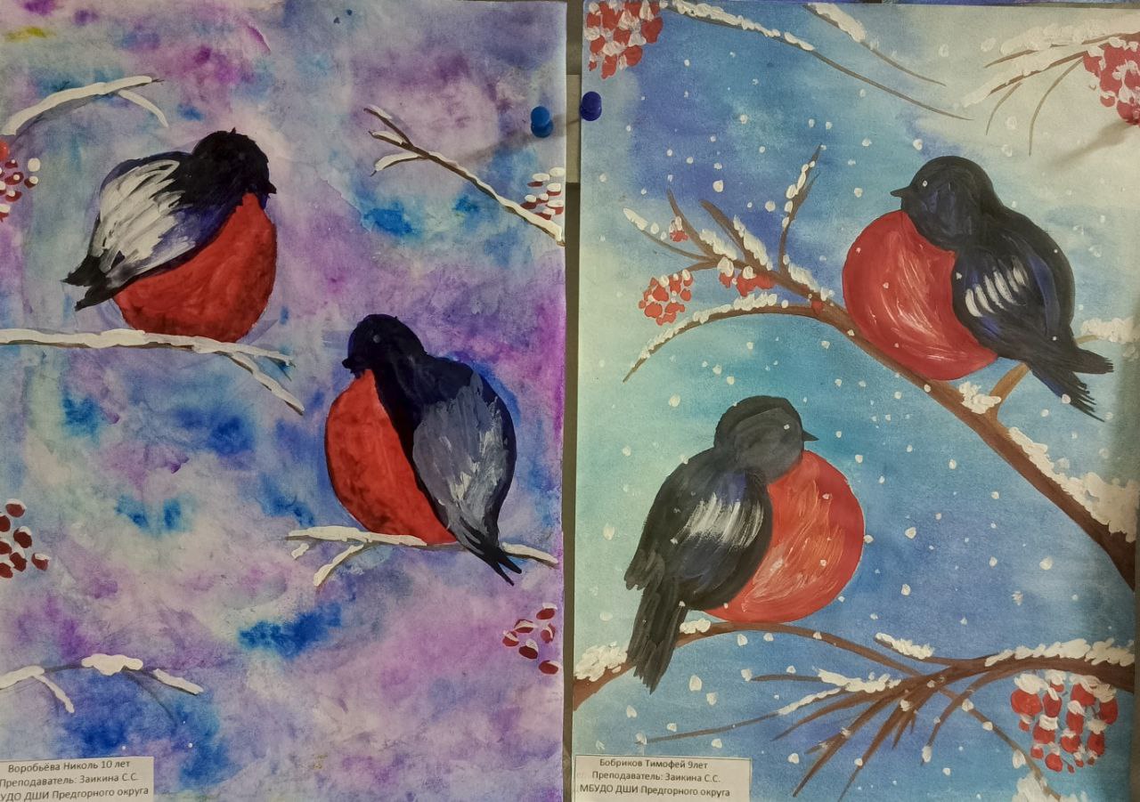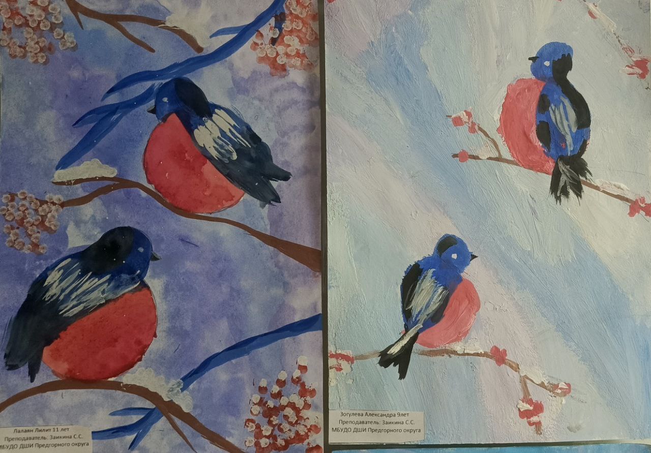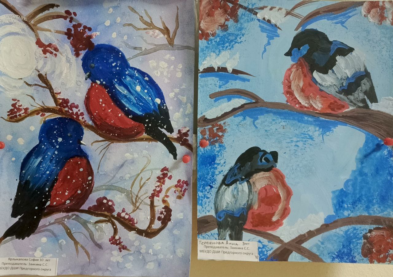 В преддверии Всемирного дня кормления птиц учащиеся 3 класса по дополнительной пред профессиональной программе в области декоративно-прикладного искусства "Декоративно-прикладное творчество", вдохновлённые красотой оперения зимующих птиц России, под руководством преподавателя Заикиной Светланы Сергеевны подготовилий чудесную выставку "Снегири на ветке". Ребята создали удивительные картины, полные тепла, цвета и детской непосредственности.Каждая работа – это маленькое произведение искусства, в котором юные художники передали свое видение этих красногрудых птичек. Здесь вы найдете снегирей, присевших на заснеженные ветки рябины, важно расхаживающих по белому покрывалу, или просто греющихся на солнышке. Разнообразие техник и стилей поражает: от акварельных этюдов до ярких гуашевых композиций.