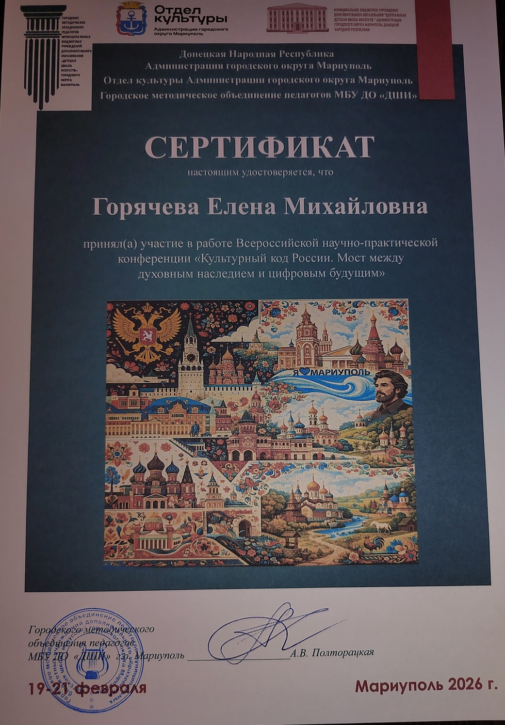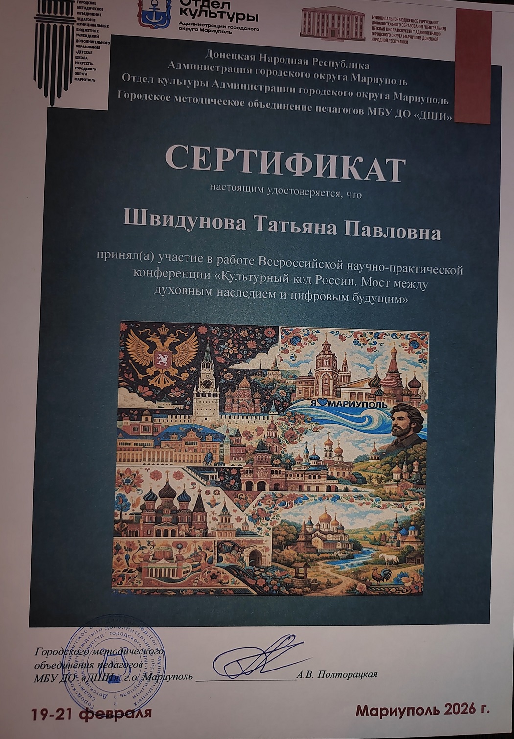 С 19 по 21 февраля 2026 года состоялась Всероссийская научно-практическая конференция «Культурный код России. Мост между духовным наследием и цифровым будущим». Это значимое событие, организованное Администрацией городского округа Мариуполь, Отделом культуры и Городским методическим объединением педагогов МБУ ДО «ДШИ», собрало ведущих экспертов и деятелей культуры со всей страны.
