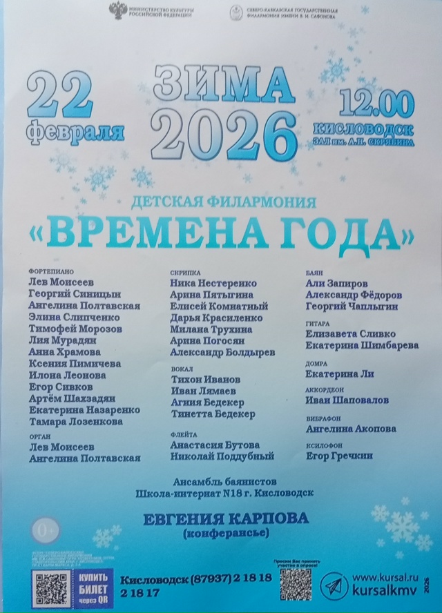 22 февраля, в последнее зимнее воскресенье, на сцене Северо-Кавказской Государственной филармонии им. В. И. Сафонова состоялся концерт Детской филармонии "Времена года. Зима - 2026", в котором приняли участие 38 участников из различных музыкальных школ и детских школ искусств Минераловодского округа, а также студенты Ставропольского краевого музыкального коледжа им. Сафонова. В концерте прозвучали произведения различных эпох и жанров, от народных песен и произведений зарубежных и русских классиков до джазовых композиций.