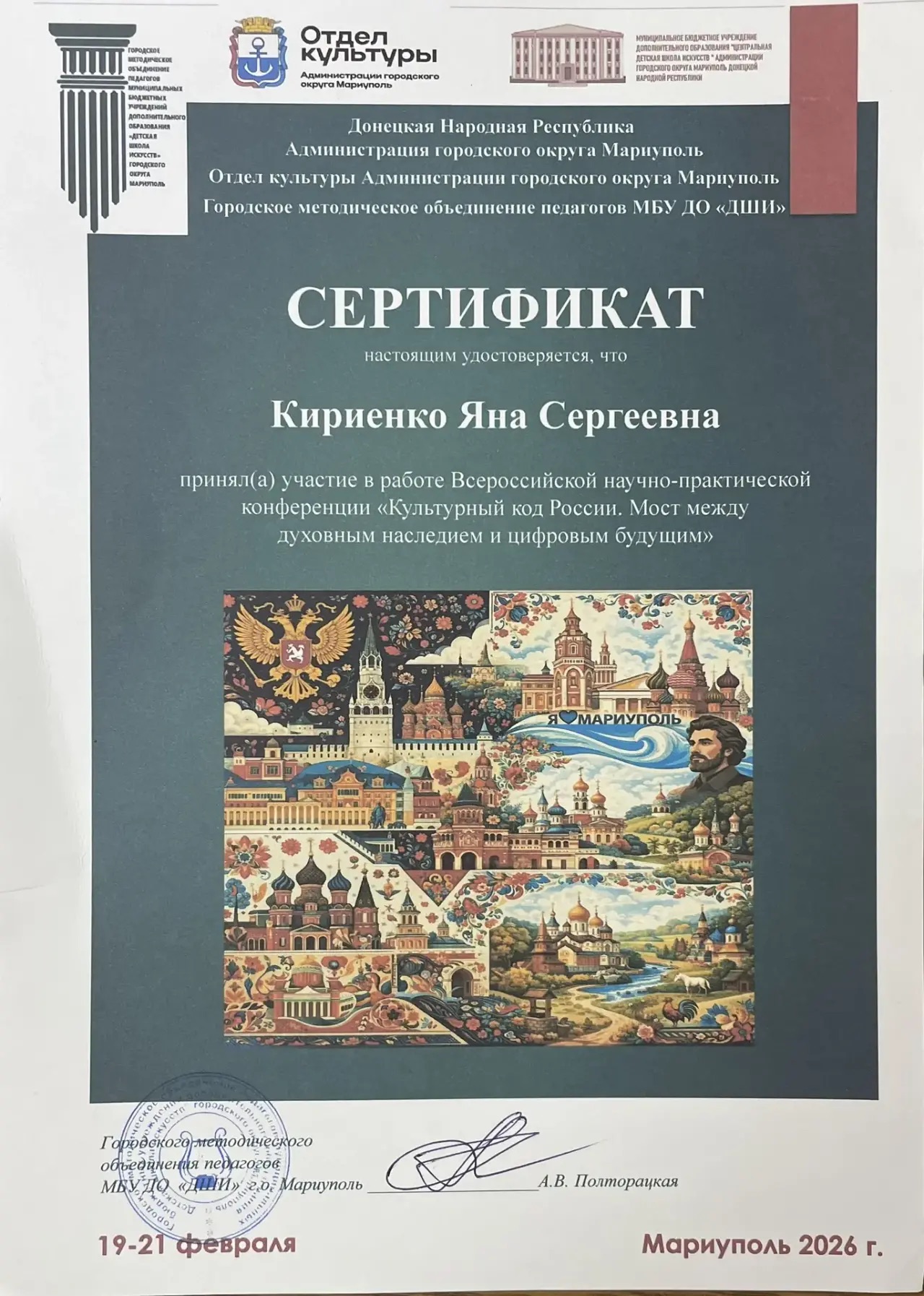 С 19 по 21 февраля 2026 года состоялась Всероссийская научно-практическая конференция «Культурный код России. Мост между духовным наследием и цифровым будущим». Это значимое событие, организованное Администрацией городского округа Мариуполь, Отделом культуры и Городским методическим объединением педагогов МБУ ДО «ДШИ», собрало ведущих экспертов и деятелей культуры со всей страны.