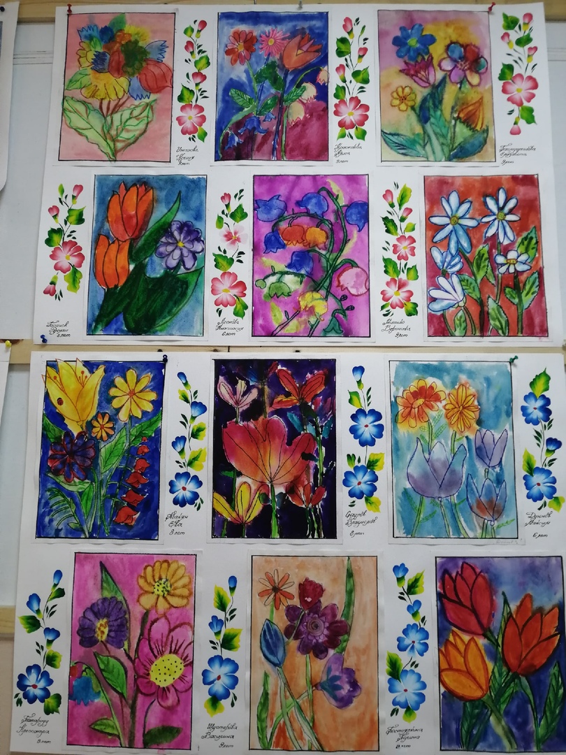 Класс преподавателя Кулецкой Т.А. показал нам прекрасное разнообразие цветочного мира в технике «по - сырому». Яркие, свежие цвета и гармоничная композиция радует глаз. Техника работы с акварелью «по - сырому», учит детей внимательности и аккуратности, ведь краски так и норовят растечься по листу.