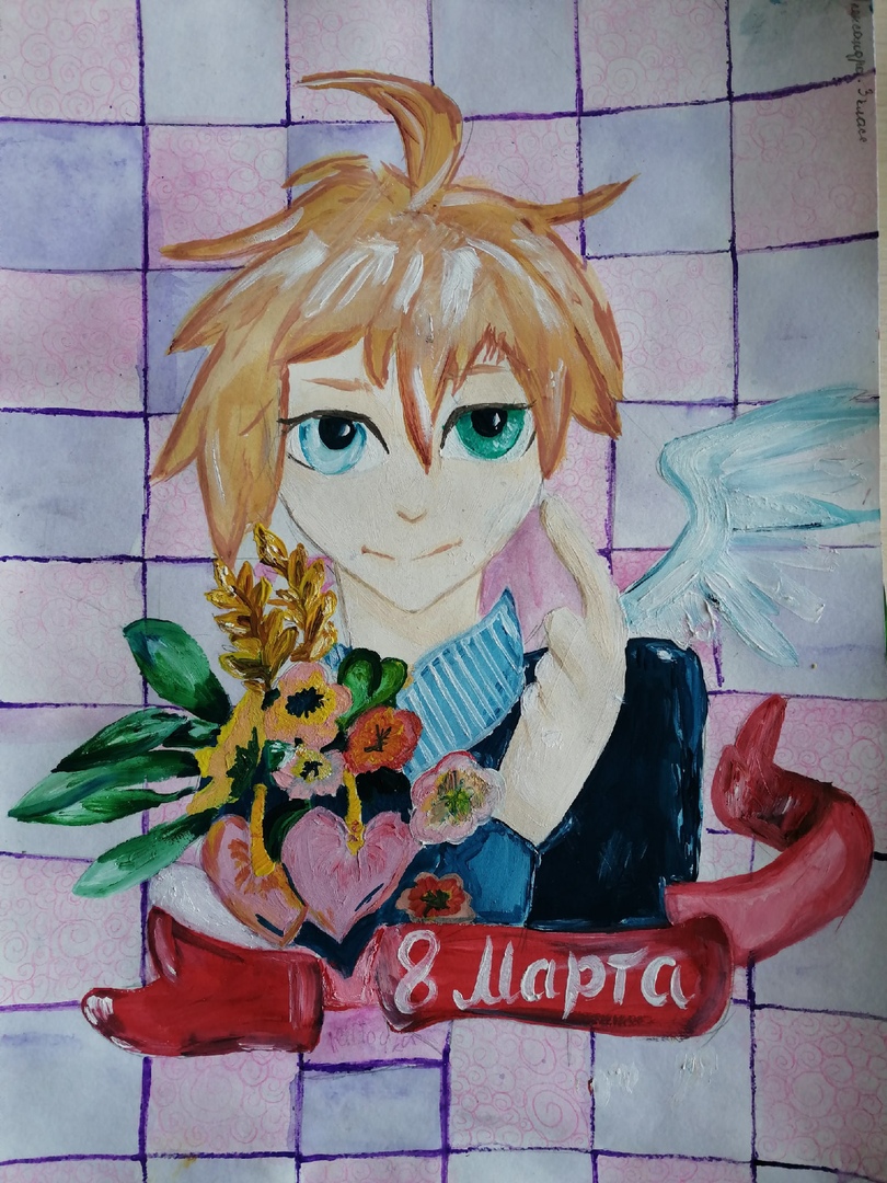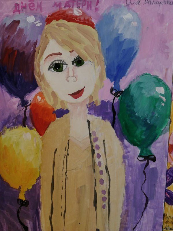 Макарова Ольга (класс преподавателя Кулецкой Т.А.) выполнила работу «Мамин праздник». Работа выполнена в технике гуашь.