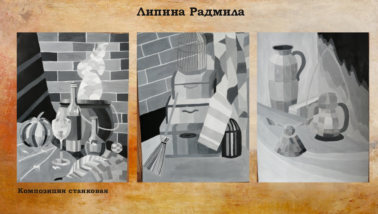 Особое внимание уделено грамотному композиционному эскизированию, которое начинается от поиска равновесия и гармонизации цвето-тональных пятен, масс в листе. Активное использование декоративных возможностей линии, пятна, фактуры, графических возможностей орнамента, стилизация формы для создания необходимого художественного образа