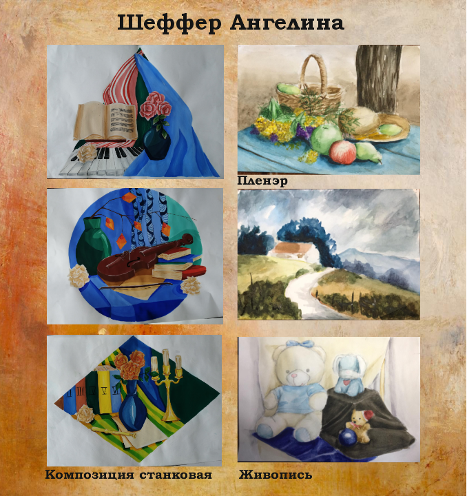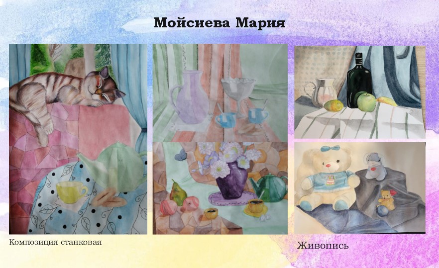 Работы класса преподавателя Курьяновой Анастасии Андреевны выполнены в техниках акварель, гуашь, смешанные техники. Картины с помощью подобранных цветовых гармоний, передают солнечное, весеннее настроение. Учащиеся учились изображать животных и цветы, передавать фактуры и плановость.