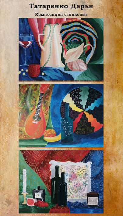 Экспозиция выставки включает в себя 21 экзаменационную работу выпускников художественного отделения детской школы искусств ст. Ессентукской 2020 года, выполненных в рамках предмета «Станковая композиция». Итоговая аттестация в детской школе искусств ст. Ессентукской по учебному предмету «Композиция станковая» проходящая в 10-м семестре (5 кл., 2-е учебное полугодие) является составной и обязательной частью контрольных мероприятий по дополнительной предпрофессиональной программе в области изобразительного искусства «Живопись». Формой итоговой аттестации является экзамен – просмотр итоговых выпускных экзаменационных работ (серии работ по теме «Декоративный натюрморт»)