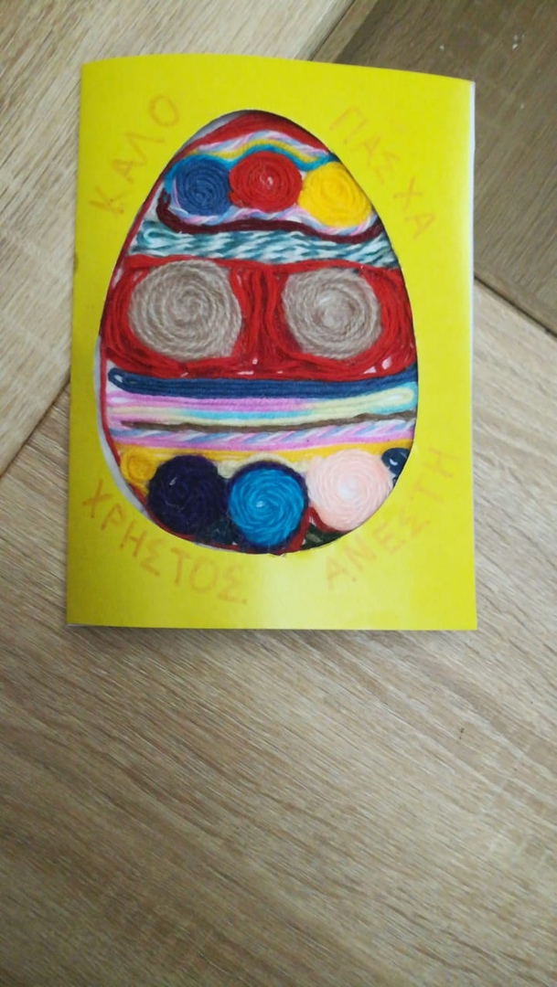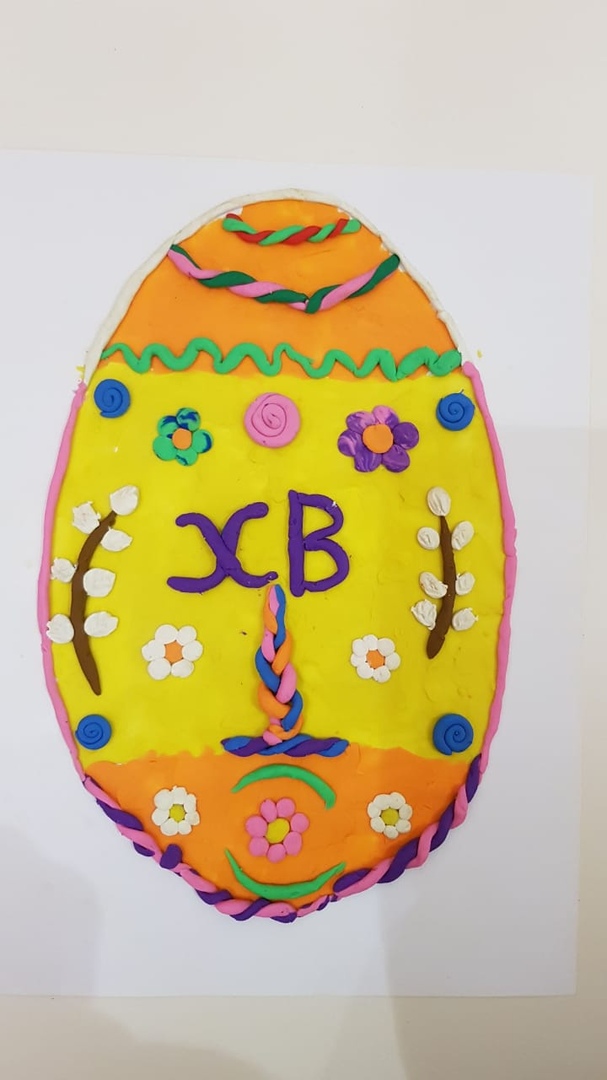 1 класс, преподавателя Курьяновой Анастасии Андреевны выполнили свои композиции в техники декоративно-прикладного искусства. Среди ни были аппликация, нетканый гобелен, пластилиновая живопись и уникальная композиция из природных материалов. Оригинальное и яркое пасхальное яйцо, в технике пластилиновая живопись представила нам Авакян Ева. Оно выполнено в ярких оранжево – желтых оттенках, с элементами стилизованных вербных веточек и цветов. Постоялкина Полина выполнила пасхальное яйцо в технике аппликации. Из яйца на нас смотрит милый желтый цыпленок. Татариду Клеопатра вдохновившись светлым праздником, представила сразу несколько работ. Среди них пасхальная открытка, яйцо сделано в технике нетканый гобелен. Выполнена она из шерстяных ниток, сложенных в сложные и оригинальные узоры. Так же мы видим чернышенскую игрушку с пасхальными мотивами, она преподносит нам пасхальные яйца, перед ней стоит яркая живописная курочка. Так же к ее работам относиться пасхальное дерево, композиция выполненная из живых природных материалов, веток вербы и украшенная яркими разноцветными лентами и декоративными яйцами.