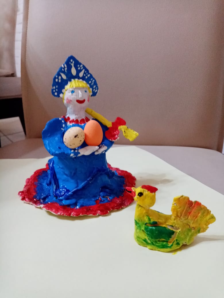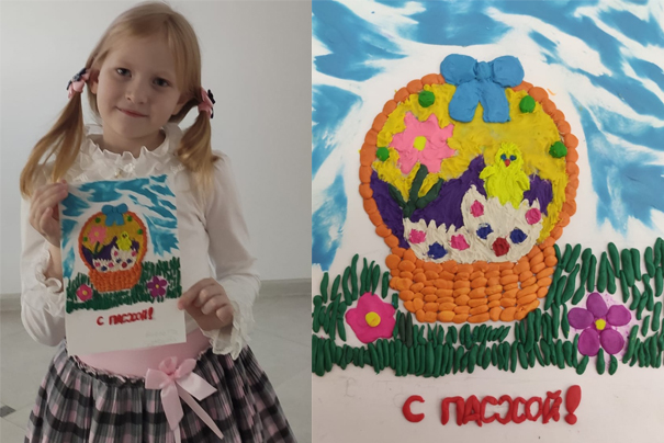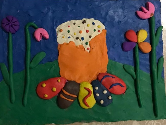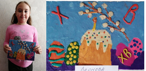 Накануне Пасхи в доме пекутся куличи и красятся яйца луковой шелухой. Такой сюжет для своих композиций взяли Кузнецова Виолетта, представившая нам плетеную корзину наполненную цветами. Из корзины на нас смотрит яркий желтый цыпленок. Леонова Анастасия поставила в центр своей работы праздничный кулич, со свечой. На фоне мы видим веточку вербы. Гасанов Руслан на ярком голубом фоне представил нам прекрасную композиции, где гармонично скомпонованы два крупных предмета расположенных параллельно друг другу и веточки вербы, которая их объединяет. Зубалов Михаил представил пластилиновую живопись, где праздничный кулич стоит в центре, окруженный яркими весенними цветами. Пастушенкова Елизавета представила отдельную объемную фигурку, где птица сидит рядом с яркими пасхальными яйцами.