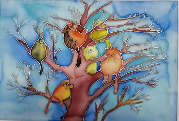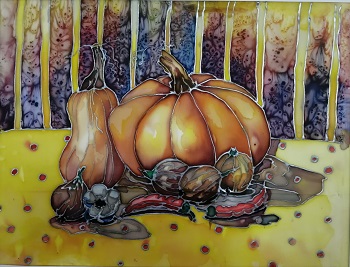 Учащиеся преподавателя Клочковой Т.С. представили необыкновенные декоративные картины. Это роспись ткани батиком. Знакомство с батиком, как и с акварелью требует внимательности и аккуратности. Краска расползается по ткани передавая живописные переходы и узоры. Ученики знакомились с жанром изобразительного искусства - натюрморт, на картинах нам представлены праздничные тематические натюрморты с вазами, цветами, животными и фруктами.