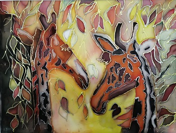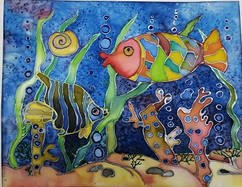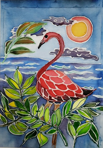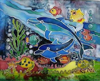 Работы на выставке представлены самые разнообразные! Африканские жирафы, фламинго и тигр, морские глубины и красочные закаты, натюрморты и цветы предстают перед нами в школьном зале! Цвета яркие и насыщенные! Всех их объединяет только техника исполнения – холодный батик.
