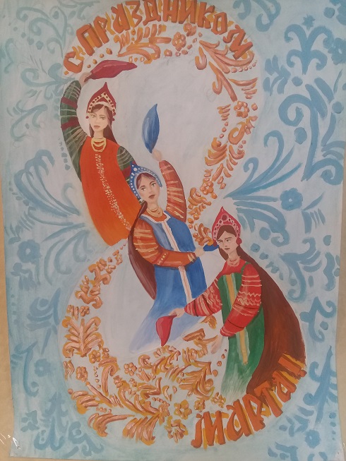 Ученица 6 класса Апевалова Наталья также выполнила открытку, все фигуры которой образуют восьмерку. В этой вариации восьмёрка состоит из трёх красавиц и различных узоров. Фон состоит из цветочного орнамента, выполненного в холодных тонах.