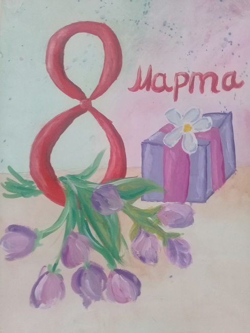 Ковалева Елизавета, ученица 1 класса, выполнила картину, на которой изображен букет цветов и подарок. Цветовая гамма очень нежная и спокойная.