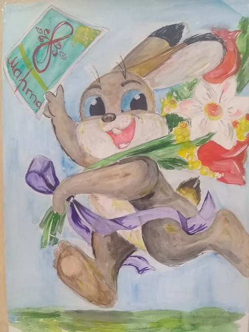 Ученица 6 класса Соколова Любовь выполнила чудесную картину, на которой вы видите счастливого зайчика, который бежит с букетом цветов и сообщает всем вокруг о том, что наступил праздник – 8 марта. Эта картина наполнена радостью и целым комплектом положительных эмоций.