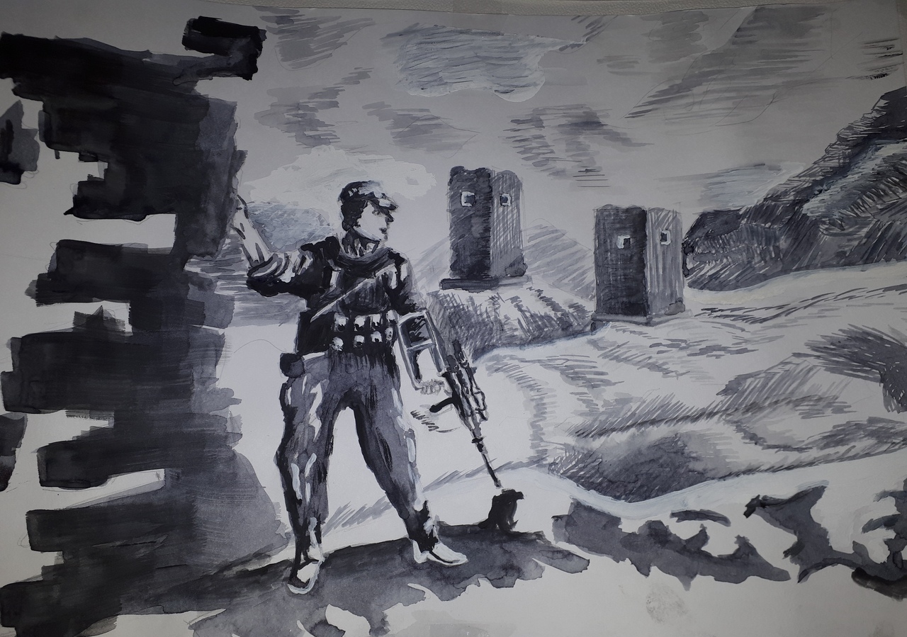Богачев Дмитрий, обучающийся в 6 классе, выполнил графическую композицию, на которой изображен солдат, внимательно осматривающий окрестности разрушенного города. Военный находится в полной боеготовности, чтобы обеспечить безопасность остальным людям.