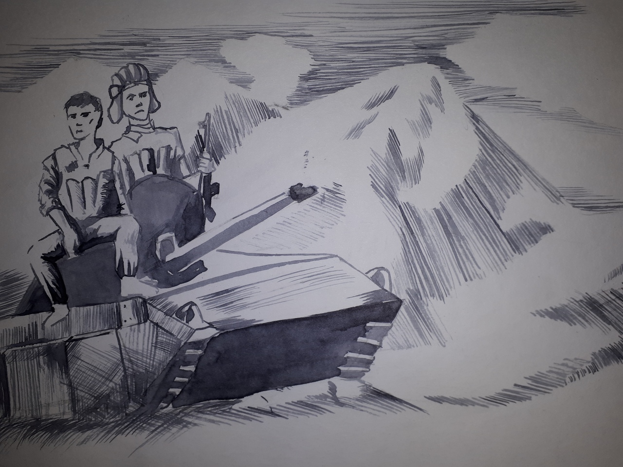 Ученик 1 класса Золочевский Григорий выполнил графическую работу, на которой изображены два солдата, сидящие на танке. У них очень серьёзные лица. Выражение лиц солдат явно передает их переживания. Григорий отлично передал напряженную обстановку того непростого времени.