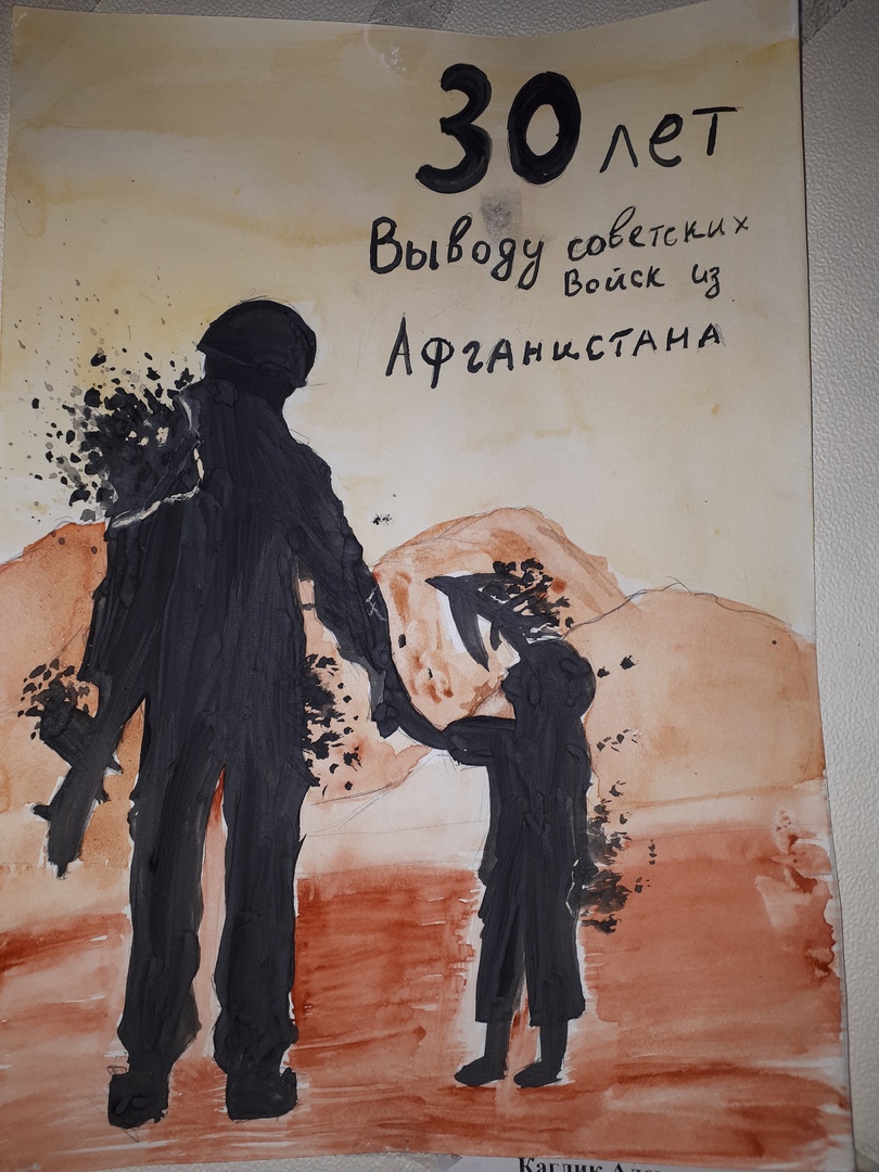 Ученица 2 класса Каглик Екатерина представила вашему вниманию картину, на которой изображены представители двух поколений, пришедшие почтить память погибших в той войне. В руках у ребенка букет цветов красного цвета, который является самым ярким пятном на картине и обращает на себя внимание зрителя. На заднем плане летит птица. Весь сюжет картины говорит о трепетном отношении всех поколений русского народа к произошедшим событиям времён войны в Афганистане.