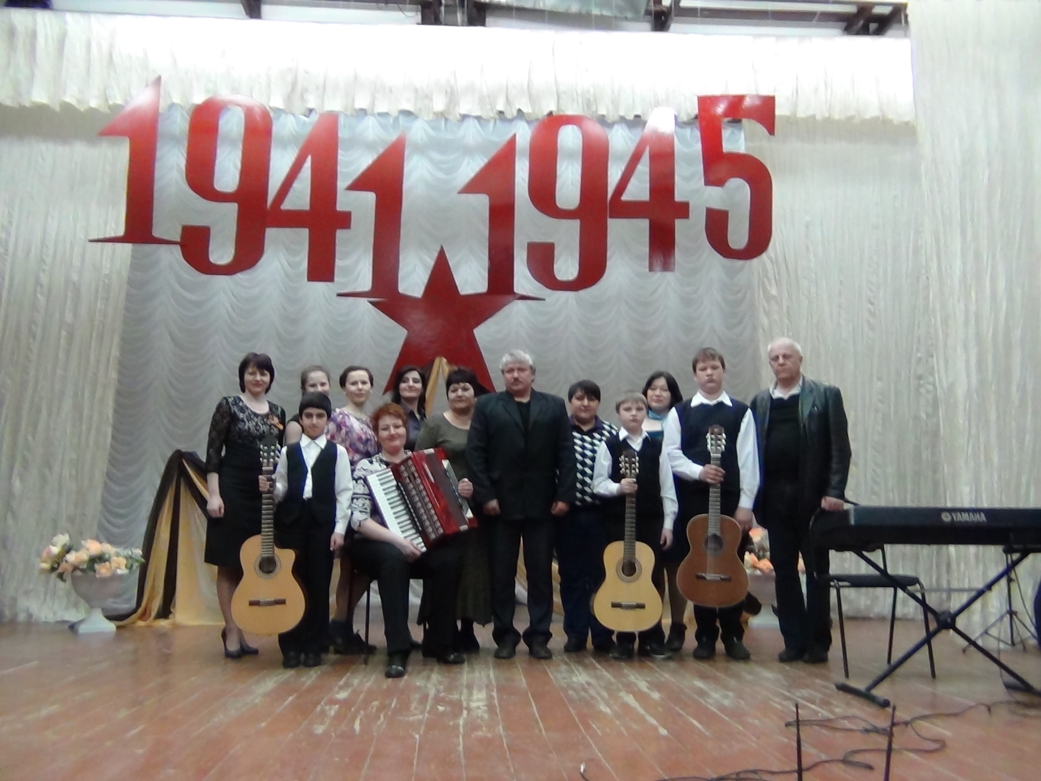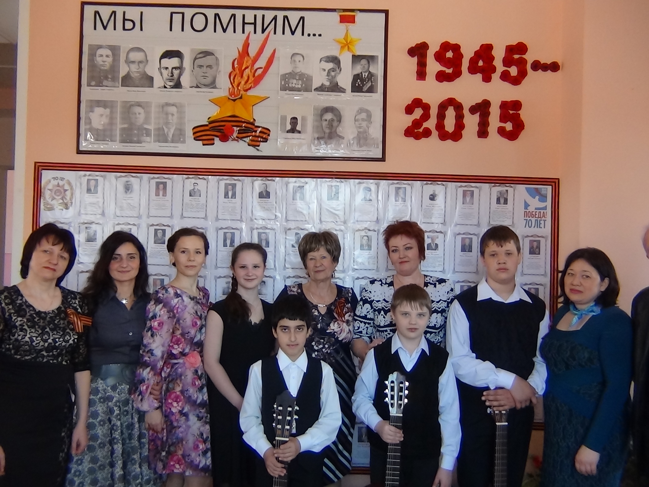 Очень тепло были встречены выступления юных музыкантов: трио гитаристов в составе Чеботаева Дмитрия, Согомонян Рафаэла, Воробьева Артема. Вокальный дуэт в составе Шевцовой Елены и Чеботаевой Ольги напомнил слушателям лучшие песни военных лет, которые с радостью были подхвачены ветеранами. Выступление молодой певицы Сагателян Кристине было волнующим и передавало радость Победы и весеннюю свежесть.