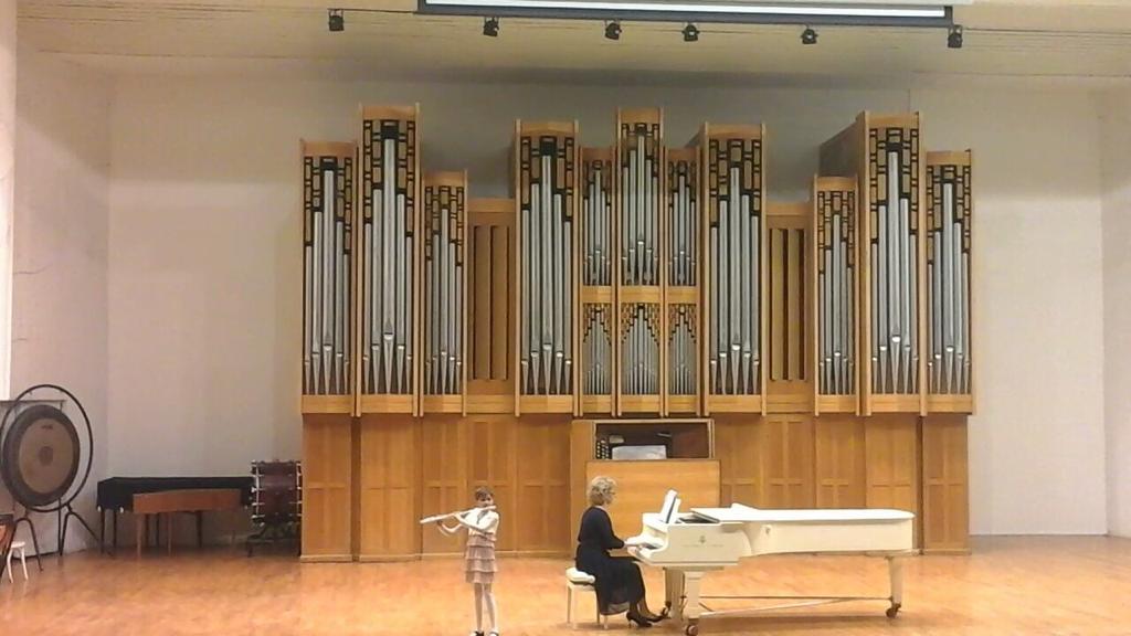 Выступление Еременко Ольги (флейта), преподаватель Кириенко Яна Сергеевна, концертмейстер Швидунова Татьяна Павловна, настроило слушателя на игривый лад и отвлекло от осенних раздумий. Ольга исполнила джазовую композицию Г.Бифтинка « Апрельские шутники».