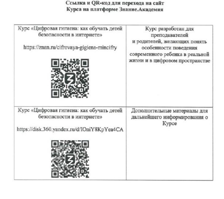 В соответствии с письмом Врио директора Департамента обеспечения кибербезопасности Министерства цифрового развития, связи и массовых коммуникаций Российской Федерации Е.В. Хасина сообщаем, что ввиду необходимости формирования у молодого поколения навыков безопасного поведения в Интернете в целях укрепления цифрового суверенитета и повышения уровня кибербезопасности государства Минцифры России считает целесообразным поддерживать инициативы, реализуемые в рамках Концепции информационной безопасности детей в Российской Федерации, утвержденной распоряжением Правительства Российской Федерации от 28.04.2023 № 1105-р. В этой связи Общероссийской общественно-государственной просветительской организацией «Российское общество «Знание» разработан бесплатный просветительский онлайн-курс «Цифровая гигиена: как обучать детей безопасности в Интернете» (далее — Курс). Авторы Курса делятся